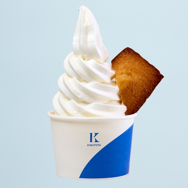 極上牛乳ソフトに焼きたてフィナンシェを1/2のせました。もちっと濃密な食感のソフトクリームとバター香るフィナンシェのマリアージュ。