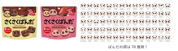 『さくさくぱんだ』は1996年に発売し、本年で発売25周年を迎えるチョコビスケットです。現在は「幸せみつけた、癒しのぱんだ」をコンセプトに、レギュラー商品の『さくさくぱんだ』、期間限定フレーバー、ファミリーパックを展開しています。チョコのぱんだの顔は70種類あります。さくさくのビスケットと2種類のチョコを組み合わせたこだわりの味わいだけでなく、様々なかわいいぱんだの表情を、食べる度に楽しむことができます。
