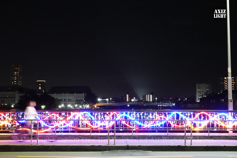 西九条歩道橋にも登場したデジタル透過パネルが正蓮寺川公園仕様の特別演出でこちらにも登場!延長25Mにもおよぶフルデジタルフルカラーイルミネーションは、大迫力の光りのショー演出でお出迎え!!