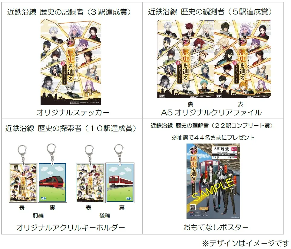 3駅、5駅、10駅達成賞は無くなり次第終了となります。また22駅コンプリート賞は駅に展示している「おもてなしポスター」をモチーフとしたもので、絵柄は全部で44種類あります。前編・後編合わせて抽選で44名さまにプレゼントします。なお絵柄はお選びいただけません。