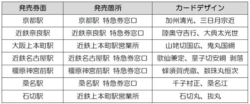 コラボ企画の実施を記念して、各駅にて異なる刀剣男士のオリジナルカード付き記念入場券を発売します。