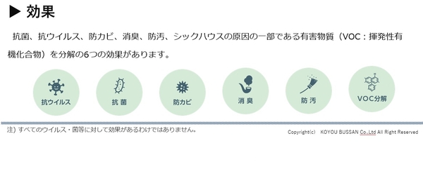 抗菌、抗ウイルス、防カビ、消臭、防汚、シックハウスの原因の