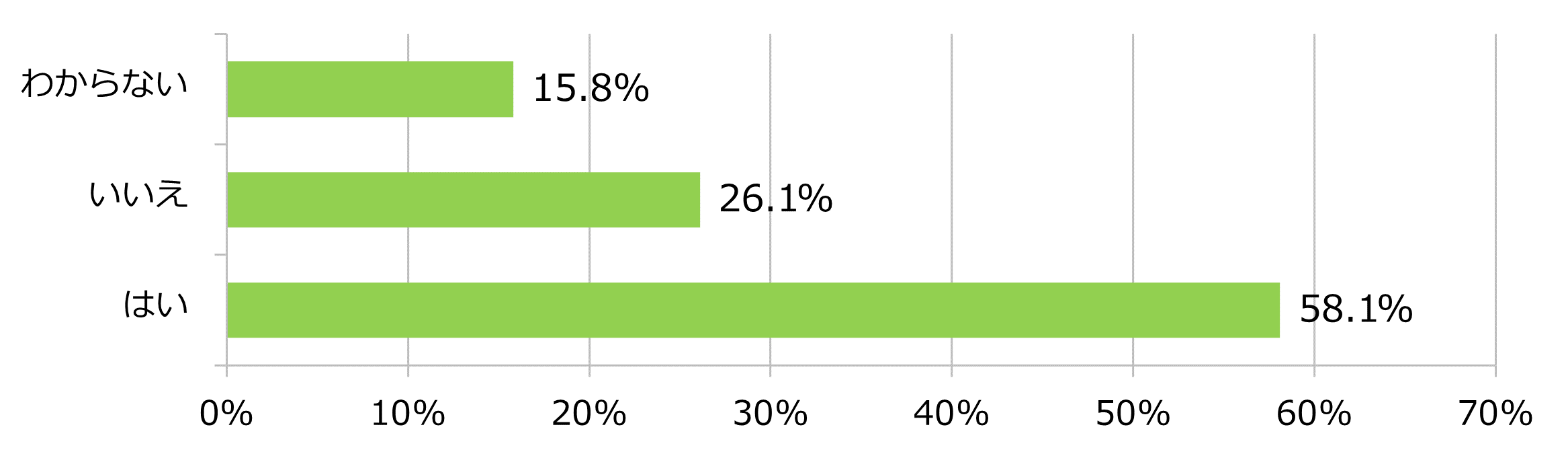 5. 回答者の自転車損害賠償保険加入の認識については、58.1%が加入している、26.1%が加入していない、15.8%がわからないと回答した。(図8)