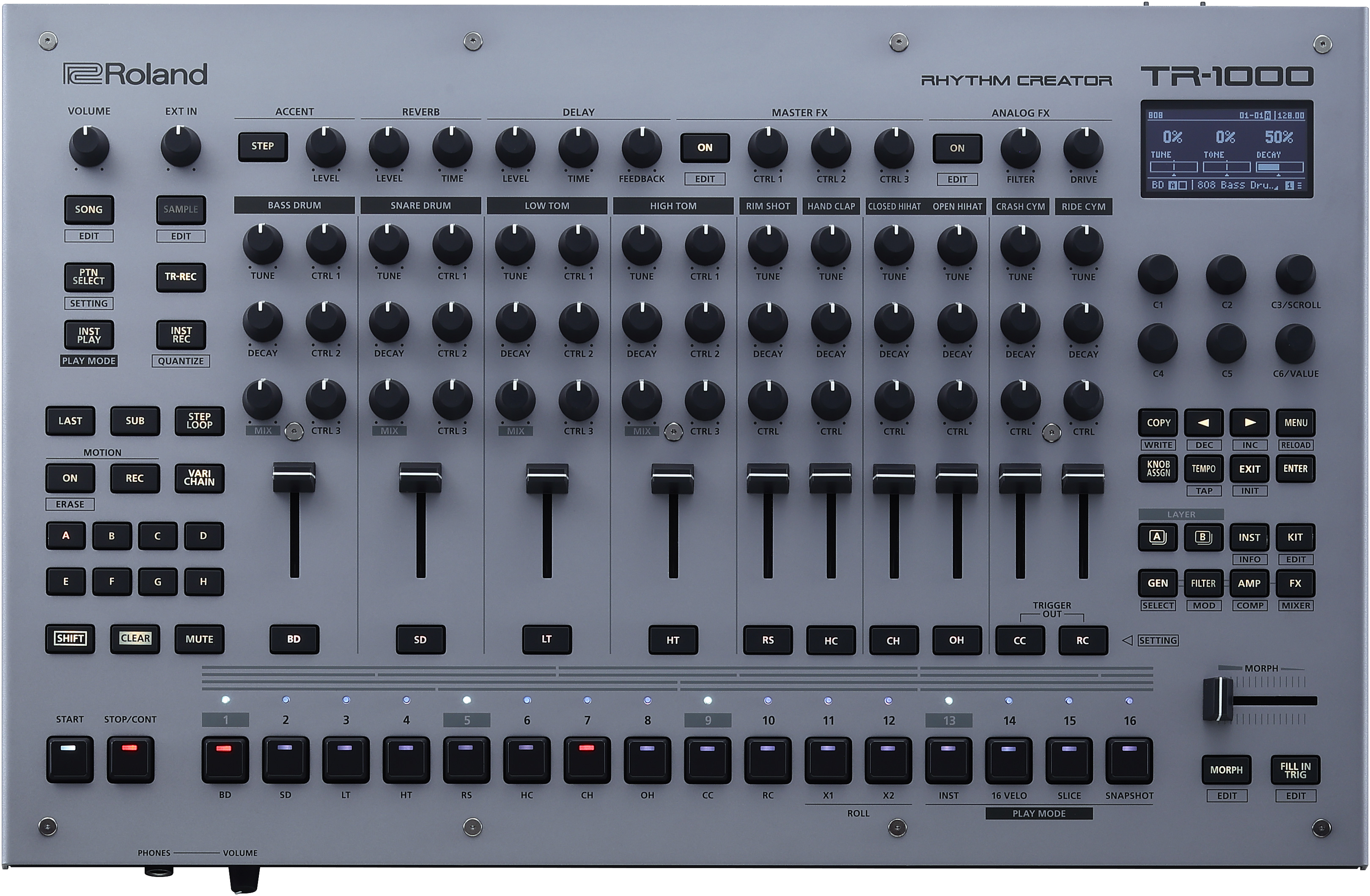 今回発売する『TR-1000』は、「TRシリーズ」の新たなフラッグシップ・モデルであり、ローランドとして約40年ぶりにアナログ音源を搭載したリズムマシンです。「TR-808」「TR-909」から厳選した16種類のアナログ回路を受け継ぎ、新たに開発したサウンド・エンジンを搭載。ヴィンテージ・サウンドはもちろん現代的な新しい表現も実現します。さらに、「ACB」を用いて「TR-808」/「TR-909」を再現した21種類の「8X」/「9X」モデルを含む、多彩なデジタル・サウンドを網羅。最新のサンプリング技術、エフェクト(音声加工機能)、シーケンサー(音源を自動演奏させる機能)が融合し、音楽制作の自由度と操作性を飛躍的に高めた、プロフェッショナル・クオリティの音楽制作ツールです。