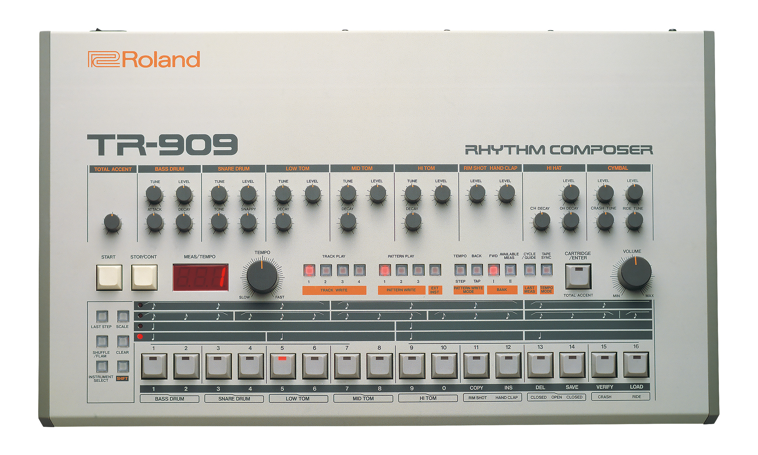 1983年に「TR-808」の後継モデルとして登場した「TR-909」は、アナログとデジタルを融合したハイブリッド音源による個性的なサウンドが特長です。1980年代後半以降に隆盛したハウスやテクノなどのダンスミュージックにおいて欠かせない存在となり、現在も多くのアーティストに愛用されています。