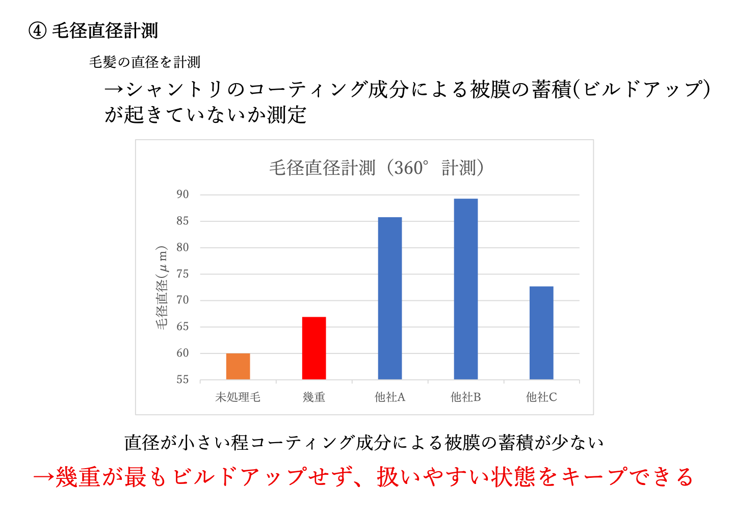 幾重は毛髪直径の変化が最も少なく、被膜の蓄積が起こりにくいことが明らかに。長期使用しても髪が重たくならず、扱いやすい素髪に近い状態を維持できることが証明されました。