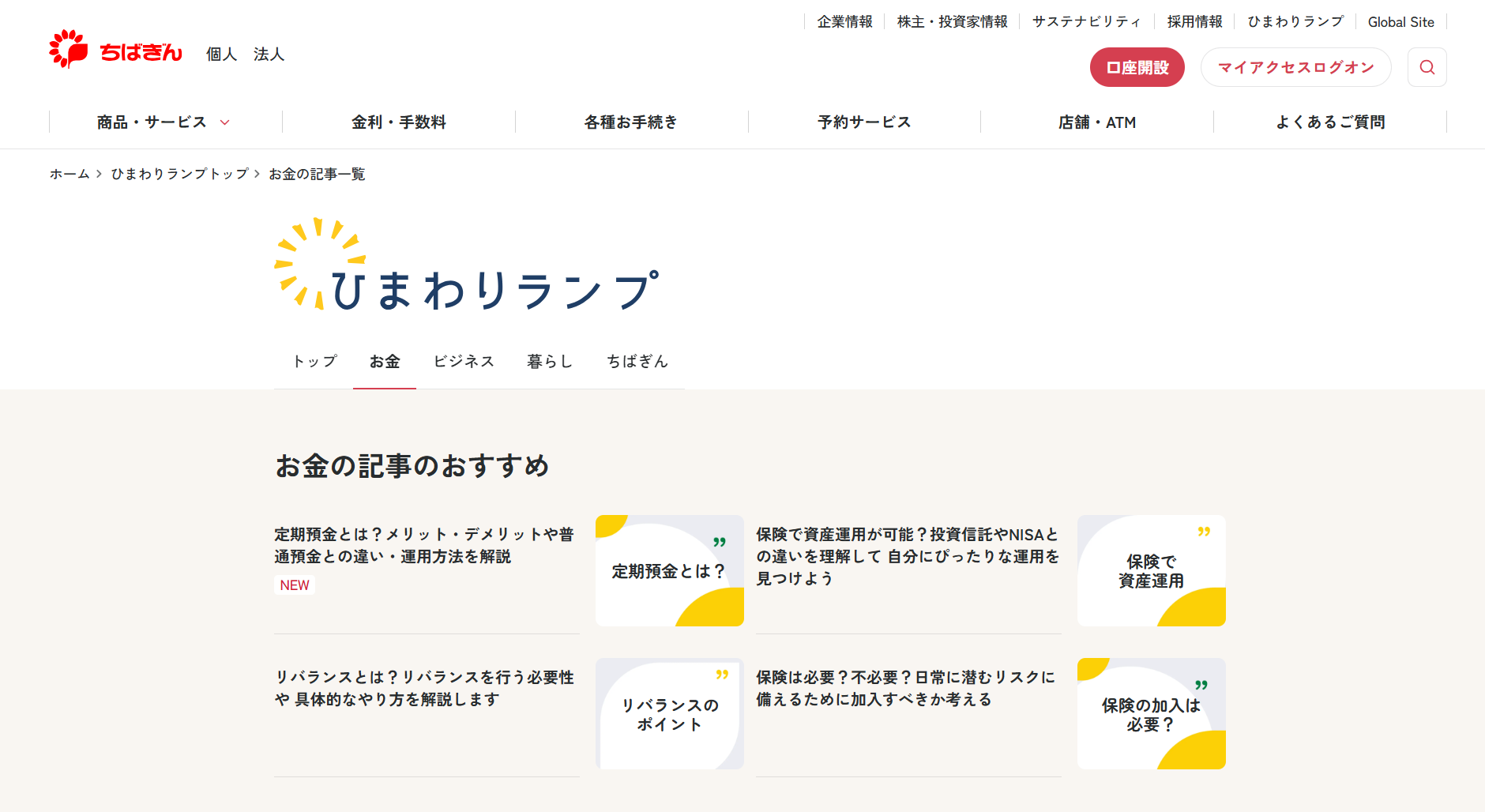 「ひまわりランプ」は、読者の悩みや疑問に寄り添って解決に導き、心を明るく照らすことをコンセプトとした情報サイトです。「お金」、「ビジネス」、「暮らし」、「ちばぎん」という4つのカテゴリに分けて、投資、資産運用、貯蓄、M&A、住宅ローンなどの情報から、専門家監修記事、ちばぎんグループの地域活性化の取組みまで幅広い情報をわかりやすく発信します。