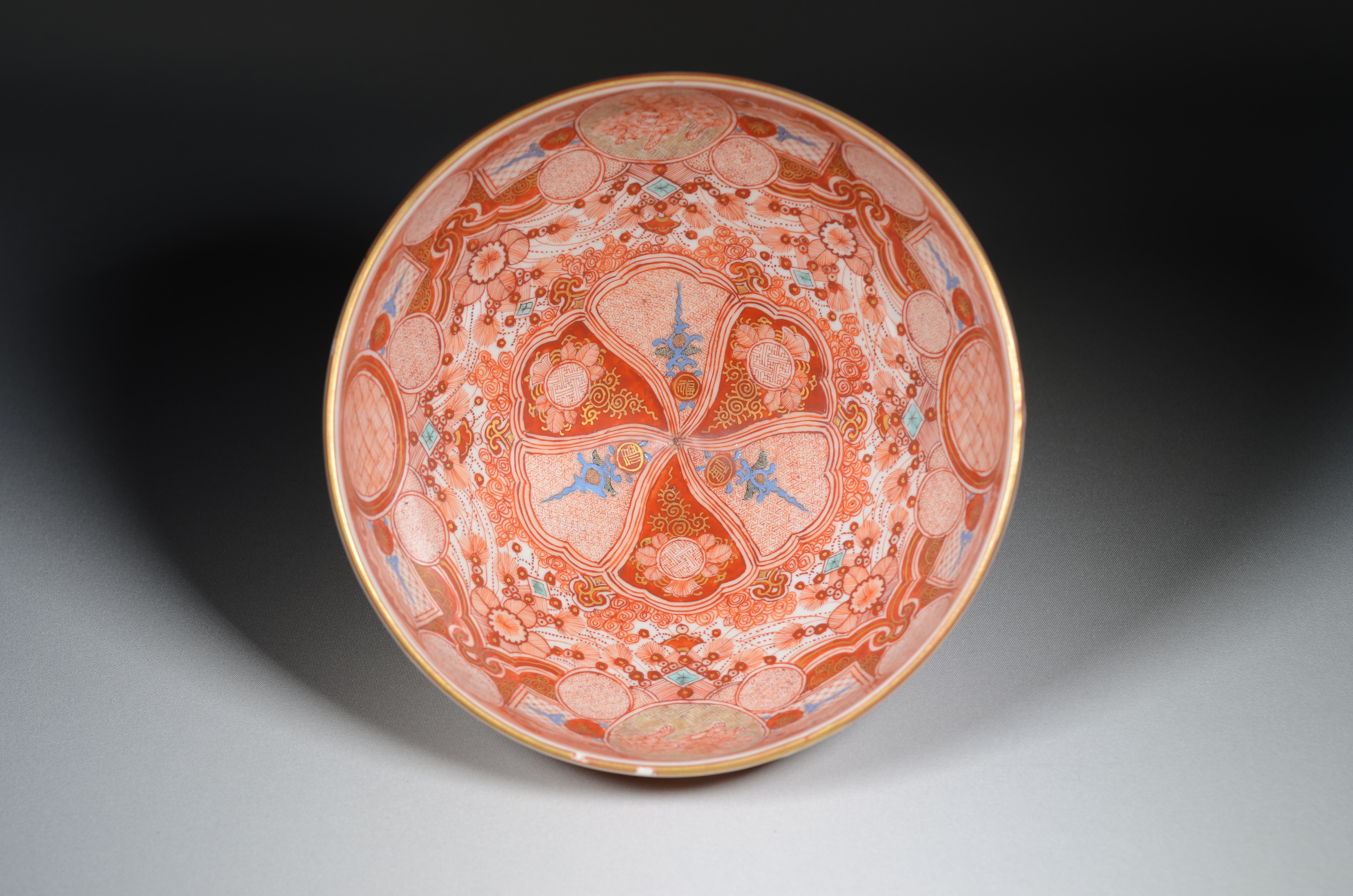宮本屋窯の赤絵は、黒みがかった赤(通称・血赤)で文様を細かく描き込んだ赤絵細描と、金彩とともに赤以外の上絵釉を用いた点が特徴です。また画題の一部に、中国・明時代の墨の文様集『方氏墨譜』から着想を得たことで独自の表現を広げました。とりわけ、主画工・飯田屋八郎右衛門(1801~1848)が、細密描写に優れた手腕を発揮しました。