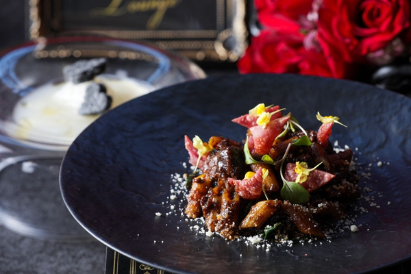 童話“不思議の国のアリス”の“ハートの女王”をテーマに、“ラズベリー”と“ショコラ”を使ったスイーツで可愛く表現した『スイーツスタンド』に、ダークプリンセスの世界を表現した新玉葱のヴルーテとオーガニックオリーヴオイルパルミジャーノ・レッジャーノのアクセント(スープ)と牛頬肉と自家製サルシッチャのラグービーツのアクセント(パスタ)がセットになった、ランチセットが登場。まるで“不思議の国のアリス”の世界に迷い込んだような、非日常の世界をご堪能くださいませ。