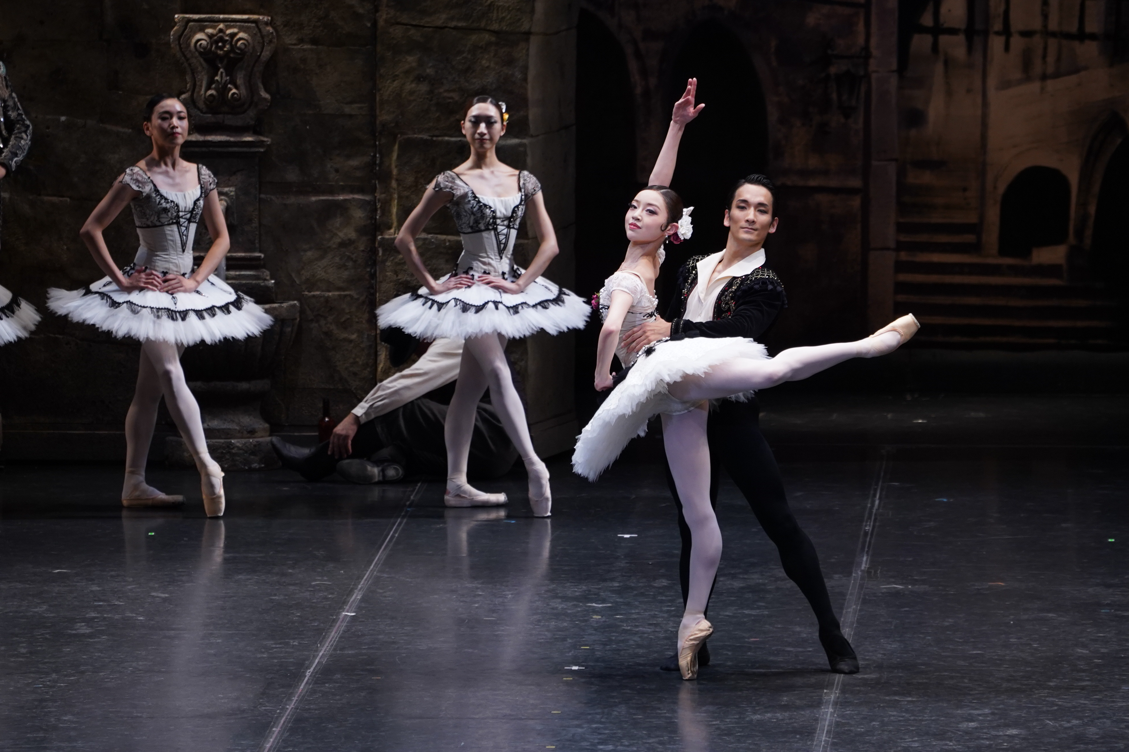 キャストはカンパニーのオールスター。キトリ日高世菜はもはや「女神」と呼びたいオーラをまとう麗人プリマで、バレエの歴史を彩ってきたカリスマの一人に数えたくなる。ひとつひとつのポーズが高貴で優美。シルエットは毅然として、バジルとじゃれあうシーンでは色っぽさやユーモア・センスも感じさせる。相手役の石橋奨也はバジル初役で、高いジャンプと力強いステップ、氷上で踊っているかのような回転など見ごたえあり、歴代バジルの中でもかなり男性っぽくセクシーだった。日高&石橋ペアはスケールが大きく、リフトも高くて華やか。一切無駄のない日高の研ぎ澄まされた踊りが、石橋の堅実なサポートでより輝かしく見えた。