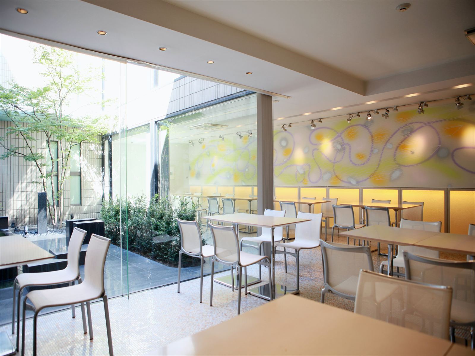 中庭の石庭のテラスから柔らかな日差しが差し込み、白を基調とした洗練されたデザイナーズ空間のカジュアルなオールデイダイニング。アーティストの壁画に囲まれ、コンテンポラリーでスタイリッシュな空間が特徴です。