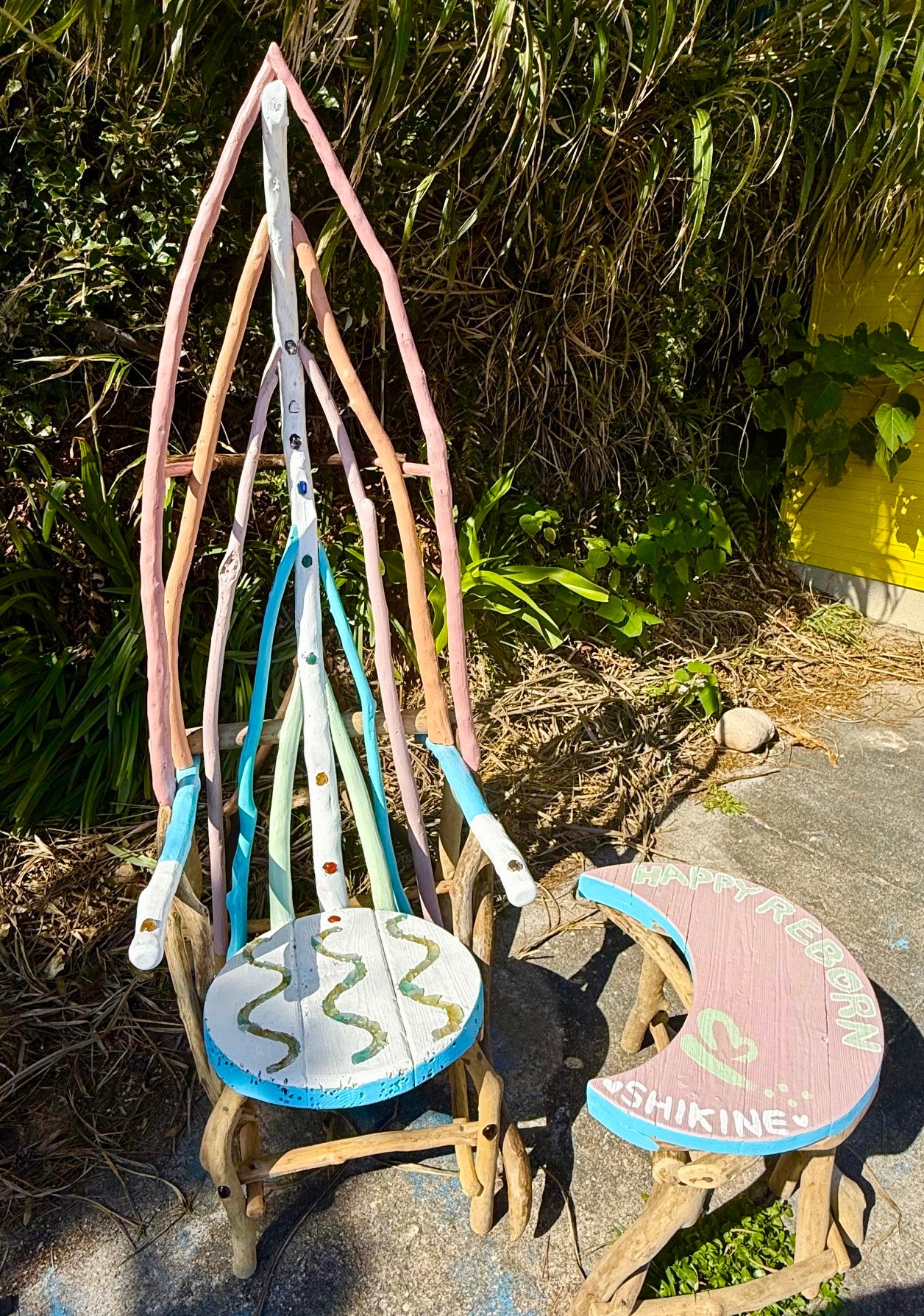 “人生を変える椅子”をテーマに式根島にたどり着いた流木とシーガラスで、島の流木アーティストと中学生が共同制作。椅子の背もたれにはチャクラに沿ったパワーストーン、手すりには水晶を埋め込み、式根島東要寺和尚による、良縁祈願や身体健全などのご祈祷も。海を望む絶景スポットに毎年10月1日から翌年4月GW前まで期間限定で設置中。