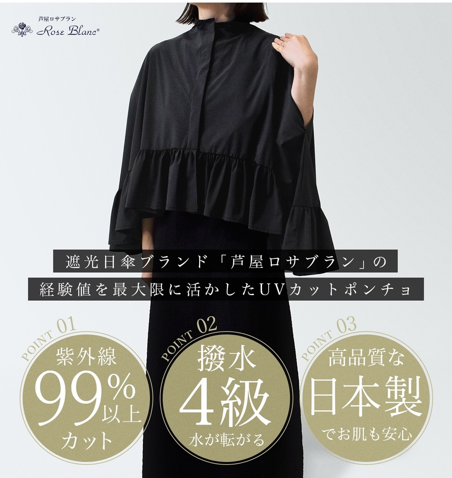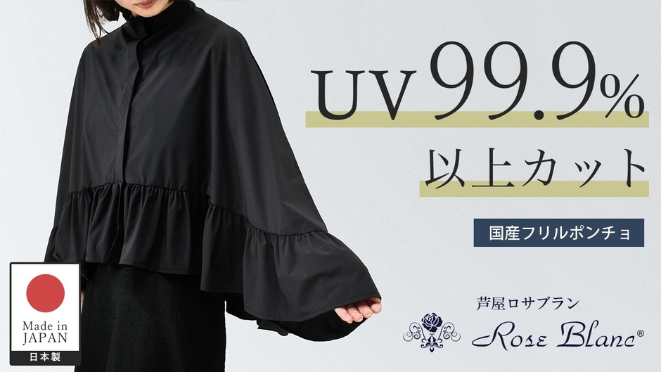 このような背景から、芦屋ロサブランは15年以上にわたる遮光製品開発の専門知識と技術を結集し、業界でも最高レベルとなる99.9%以上の紫外線カット率を実現した「UVカットフリルポンチョ」を開発しました。しかも単なる機能性ウェアではなく、丁寧に縫製されたフリルを施し、ファッション性も兼ね備えた「装うUV対策アイテム」として、美しさと実用性をで両立させています。