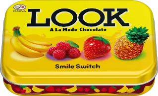 「ルック(ア・ラ・モード)」のパッケージをイメージした可愛い黄色のデザイン缶にバナナ、ラズベリー、ストロベリー、パイナップルのフレーバーのルックを各2粒ずつ詰め合わせました。歴代キャッチコピーがデザインされたオリジナルステッカー1枚入り(全6種よりランダム)。
