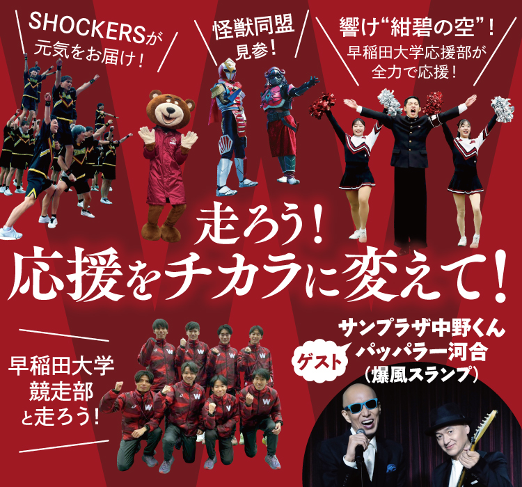 イベント当日は、選手・観客・ご来場いただいた方全員で早稲田大学校歌や応援歌「紺碧の空」を歌います。また、早稲田大学競走部の現役選手がゲスト参加(予定)するほか、多彩な学生団体のパフォーマンスが会場を盛り上げます。