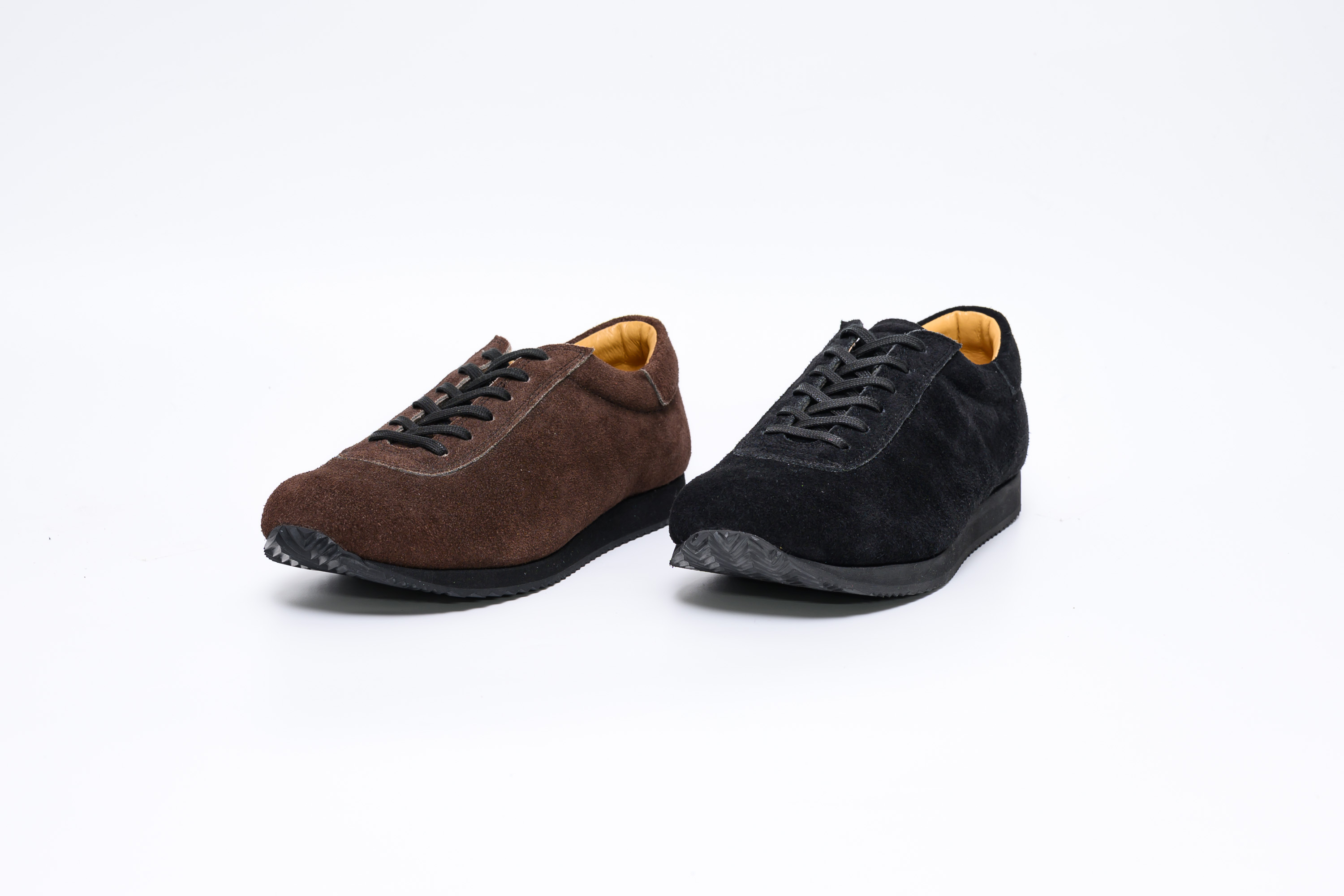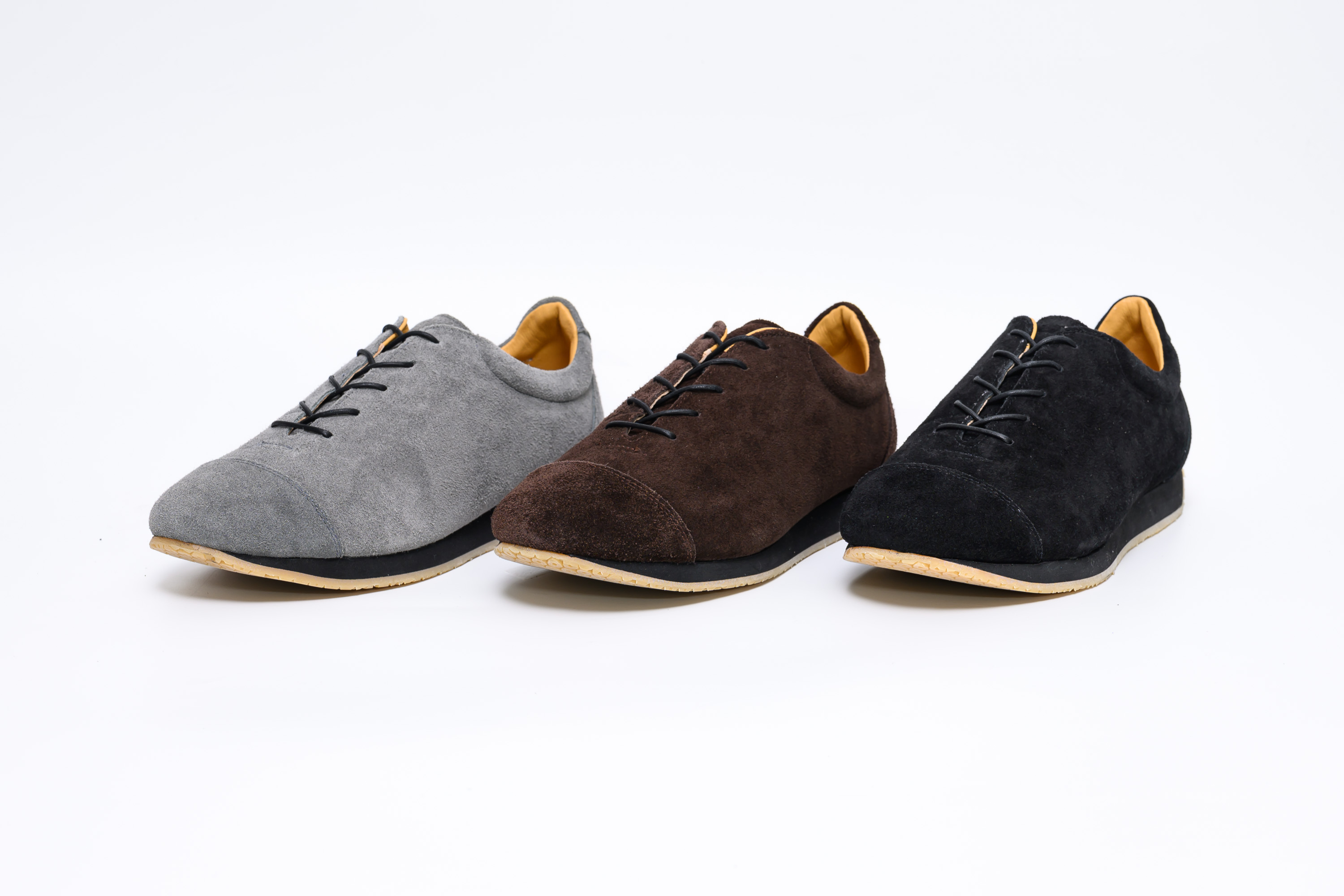 ソールをブラックに、ライニングをキャメルに仕上げ、シューレースには蝋引きの靴紐を採用。革靴のような端正さが加わり、日常のスタイルに落ち着いた印象を添えます。