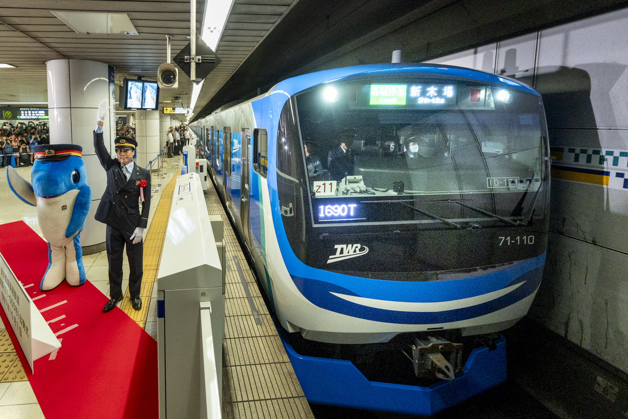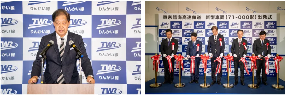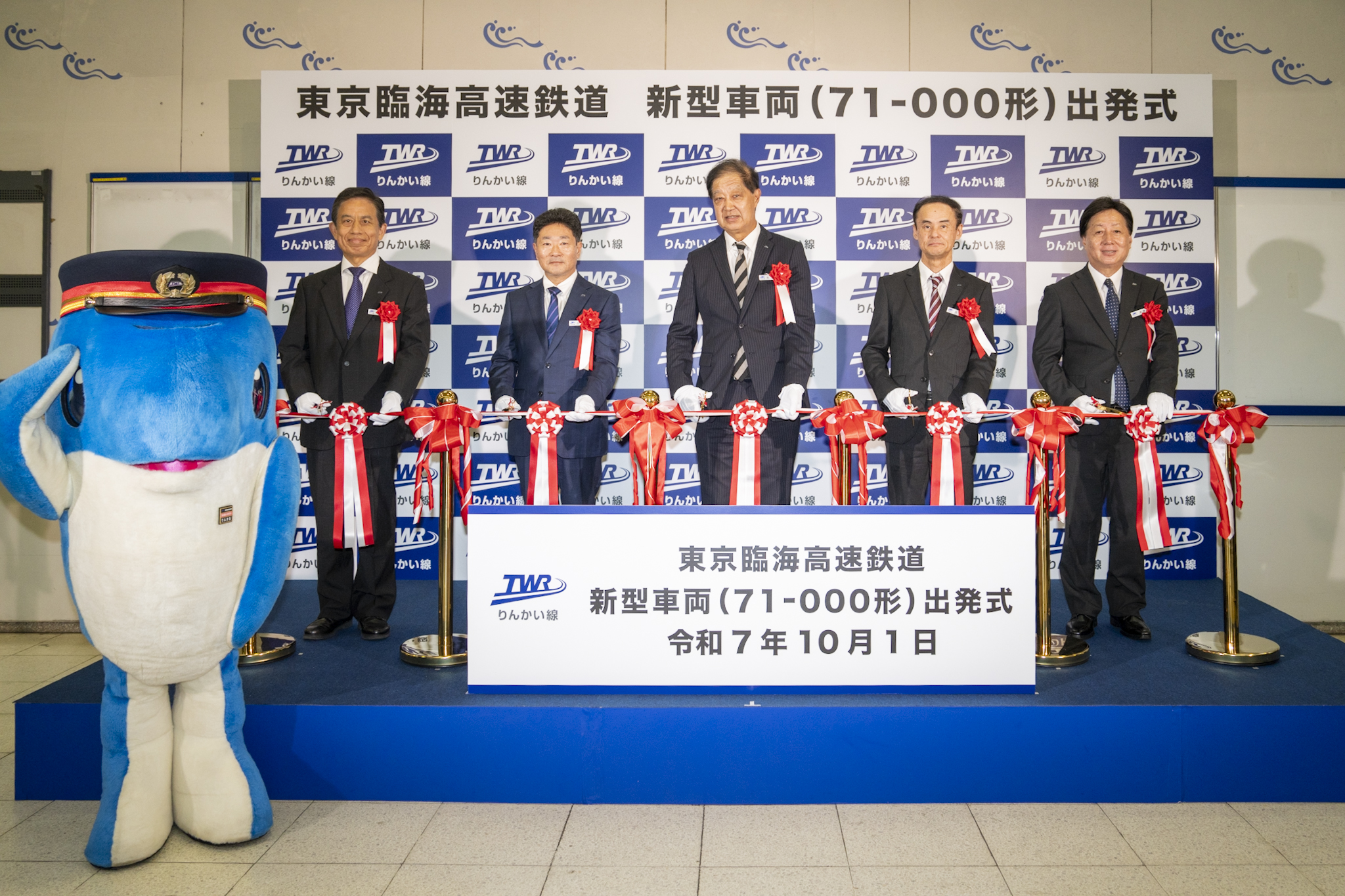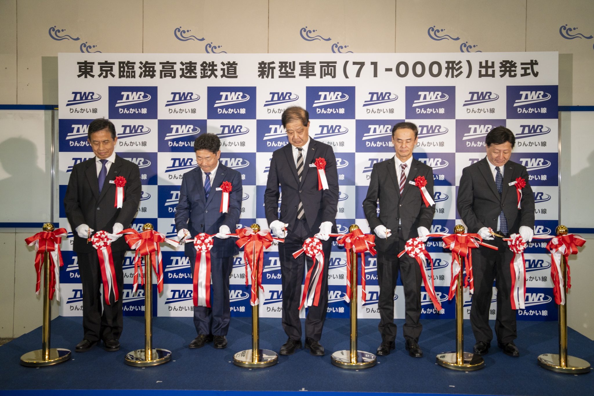 りんかい線 新型車両『71-000形』ついにデビュー! 「優しい微笑み」をイメージした新車両。安心・安全・快適性もアップグレード。 初運行を見届けるテープカット&出発式を開催! 「新型車両は東京臨海高速鉄道の新たなステージを象徴する車両」 記念すべき初運行に、盛大な歓声と拍手が沸き起こる