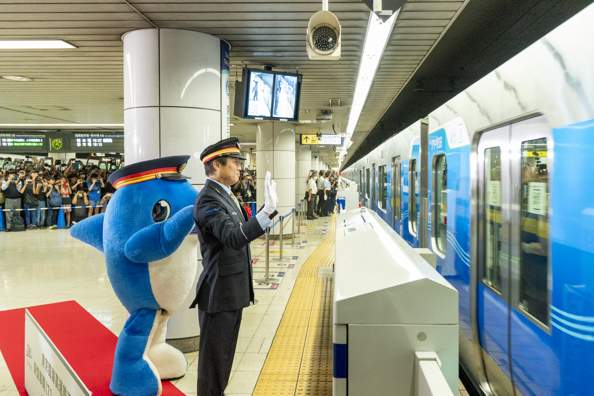 式典終了後、ホームへ移動し、いよいよ『71-000形』の初運行を迎えます。出発式には、この歴史的瞬間を見届けようと、大勢の鉄道ファンが来場。『71-000形』の到着を今か今かと待ちわびている様子でした。ホームの先頭に敷かれたレッドカーペットには、管理駅長 飯島康之とりんかるが並びます。りんかるが、集まった子どもたちに手を振る場面もありました。
