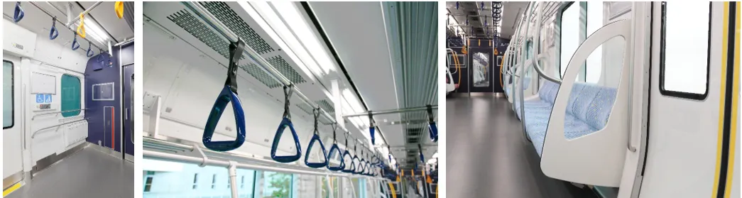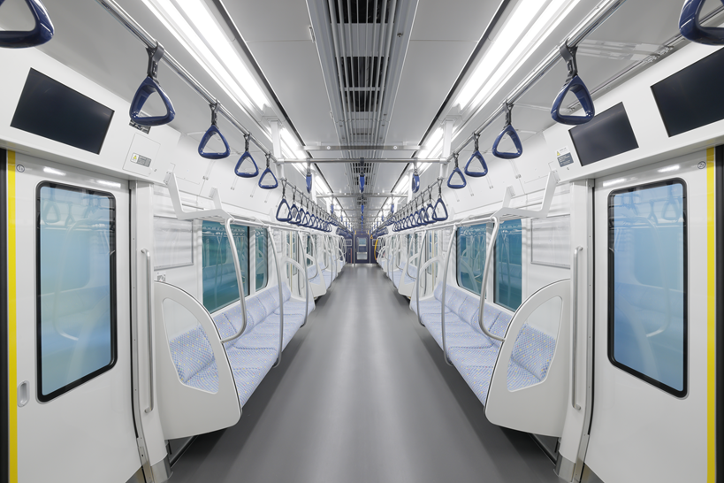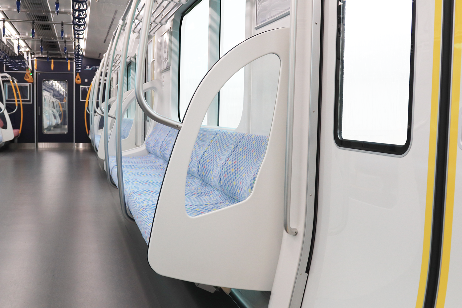 ・座席は、グレーとブルーを基調としたブロック柄とし、都会的でクールな雰囲気を表現しています。また、優先席はピンクを基調とした色とし、落ち着いた印象を持たせています。