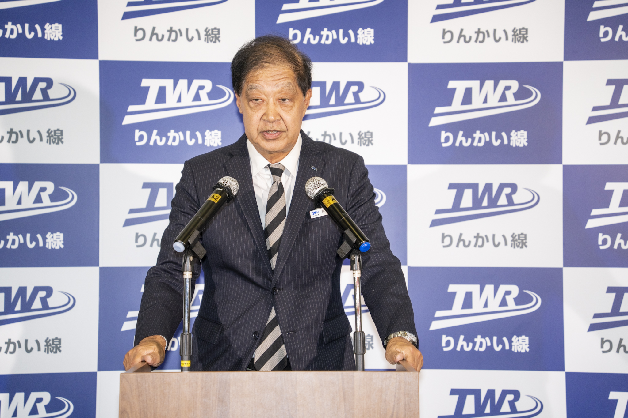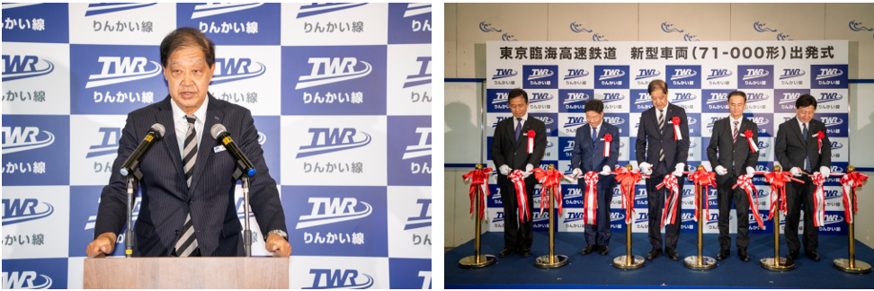 続けて「また、照明の工夫、座席の改良などによって快適性を高めているほか、車イスやベビーカーを利用される方のためのフリースペースの増設など、バリアフリーの推進にも力を入れております。デザインも特徴的なものとしており、前面は、現在の『70-000形』の色彩を継承しつつ、『優しい微笑み』をイメージし、また、側面は、海や波をモチーフにして、東京湾ウォーターフロントの水辺の空間を表現しております。さらに車内のインテリアは、ホワイトを基調にグレーやネイビーの色調でまとめ、座席をグレーとブルーを基調としたブロック柄とするなど、いずれも洗練された、クールな印象をもたせることで、親しみやすさと先進性を兼ね備えたものとしております。折しも、りんかい線が走るこの臨海地域では、明後日の10月3日に多目的次世代アリーナである『TOYOTA ARENA TOKYO』が開業いたします。また、お台場海浜公園では、新たなランドマークとなる世界最大級の噴水『ODAIBAファウンテン(※仮称)』の整備も進められており、より多くのお客様にりんかい線をご利用いただく機会が増えるものと期待しております。このように、首都東京の未来に向け、臨海地域はますます発展していくエリアであり、この地域を支える公共交通機関として、当社は、新型車両の導入はもとより、さらなる安全・安定輸送の確保、安心のご提供、お客様サービスの向上を図り、その重要な使命を果たしていく所存です。最後になりますが、今後とも、皆様の変わらぬご愛顧を賜りますよう、あらためてお願い申し上げますとともに、この『71-000形』が皆様のご利用に際し、これまで以上に快適さと彩りを添えることができますよう、精一杯努めてまいります。本日は誠にありがとうございます」と、未来を見据えた表情で、力強く語りかけました。