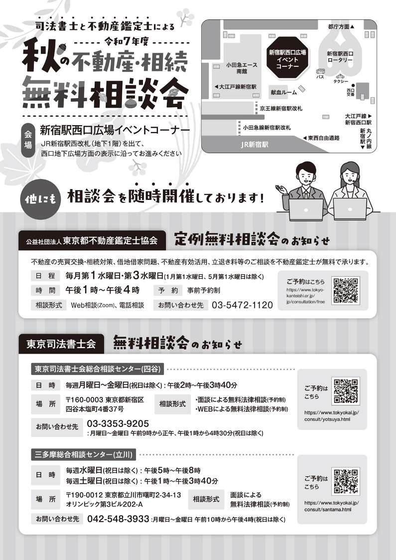 令和7年度司法書士と不動産鑑定士による 秋の不動産・相続無料相談会を10月9日(木)に 新宿西口広場イベントコーナーにて開催