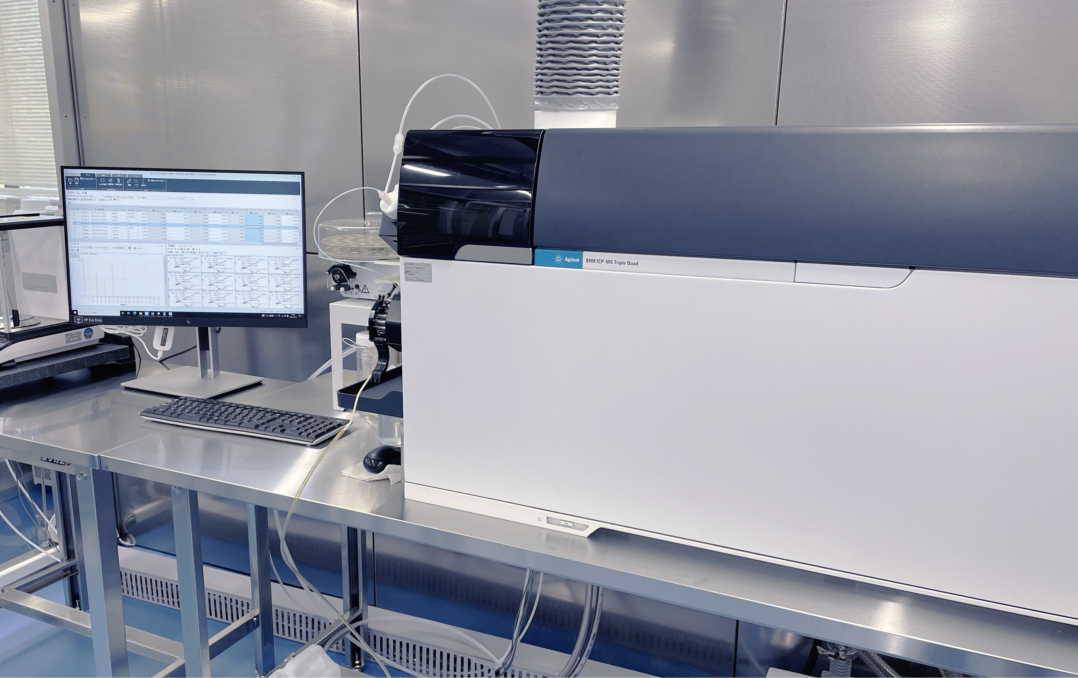 本サービスは、最新の分析装置であるトリプル四重極ICP質量分析装置(ICP-QQQ)とISOクラス1※のクリーン空間を生成する、スーパークリーン生成装置を組み合わせることで、汚染の少ない環境を保ちつつ、1μg/L(ppb)~1ng/L(ppt)オーダーまでの極微量元素を高感度・高精度に検出し、お客様がお持ちの薬剤・薬品・溶媒中に含まれる金属不純物の管理をサポートいたします。