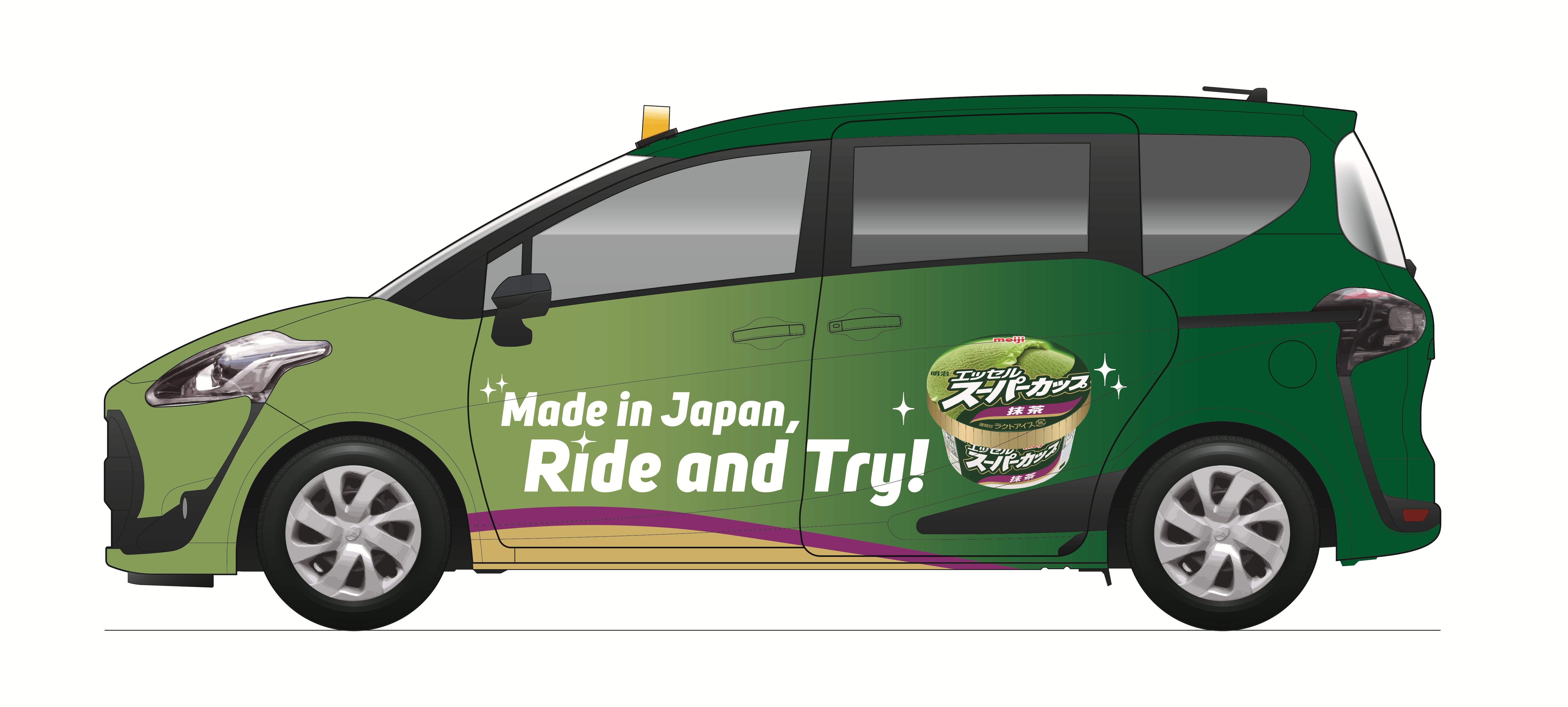 サンプリングイベントと同時期の10月9日(木)から、ラッピングタクシーが京都市内を31日間限定で走行します。外見だけでなくフロアマットやシートカバーも「明治 エッセル スーパーカップ 抹茶」仕様となっており、まるごとラッピングされた特別なデザインです。通常の運行と同様に乗車料金がかかりますが、乗車した方は無料で提供された抹茶アイスを車内で楽しめます。ラッピングタクシーは京都市内1台のみの運行。ユニークで特別な体験とともに、京都の街並みを堪能することができます。