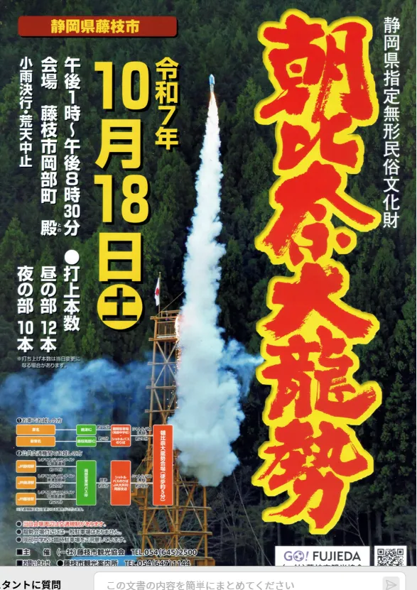 日本国内で開催される花火大会において、予約制シェア駐車場の導入数で業界随一の実績を誇る軒先株式会社(本社:東京都港区、代表取締役:西浦明子、以下「軒先」)と藤枝市観光協会」は、静岡県指定無形民俗文化財である朝比奈大龍勢(花火大会)の伝統を後世に伝える取り組みの一環として、来場者が安心してイベントに参加できる交通手段の拡充を目指し、会場周辺に予約制駐車場を設置いたします。