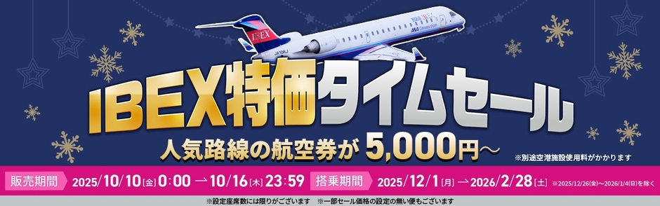 アイベックスエアラインズ株式会社(本社:東京都江東区、以下 IBEX)は、2025年12月1日~2026年2月28日ご搭乗分が対象となる「IBEX特価タイムセール 」を実施します。