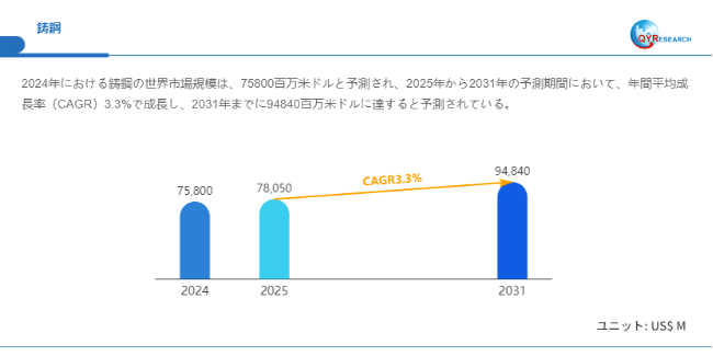 QYResearchが発表した新たな市場調査レポート「鋳鋼―グローバル市場シェアとランキング、全体の売上と需要予測、2026~2032」によると、世界の鋳鋼市場規模は2024年の約75800百万米ドルから2025年の78050百万米ドルへと順調に拡大すると見込まれ、予測期間中は年平均成長率(CAGR)3.3%で成長し、2031年には94840百万米ドルに達すると予測されている。