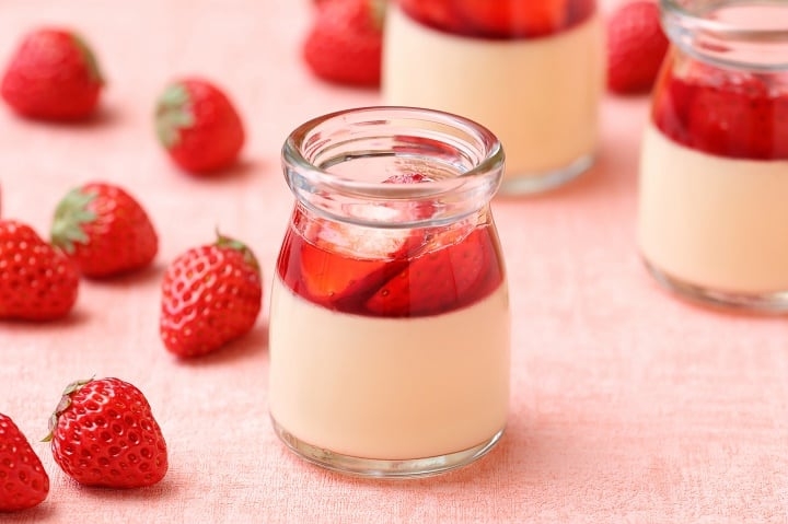 ジェを合わせたいちごと桜のベリンヌ(グラスに入れたスイーツ)、いちごのパート・ド・フリュイ(ゼリー菓子)です。いちごの甘さをしっかり残しながら、食後にぴったりの軽やかな口当たりに仕上げています。
