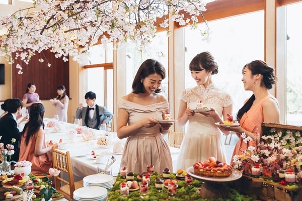 ウエディングパーティの楽しみのひとつ、デザート。軽井沢ホテルブレストンコートでは、フルコースのデザートにゲストが好きなスイーツを選べる「スイーツマルシェ」を取り入れたものがあります。このスイーツマルシェで登場するもののうち3種類に、こもろ布引いちご園のいちごを使っています。ルバーブを合わせたいちごとルバーブのタルトや、桜のブランマン