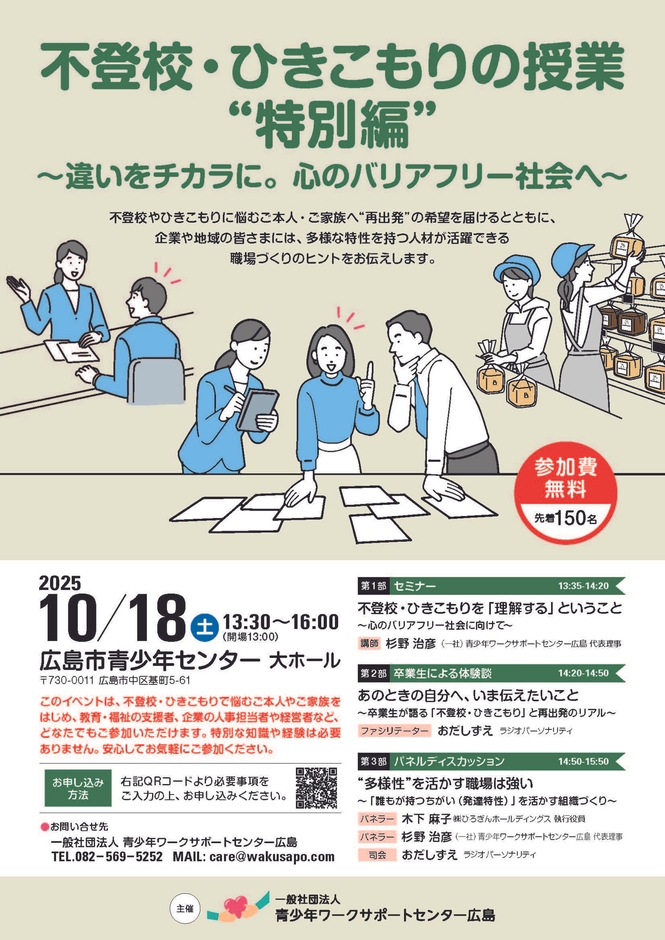 一般社団法人青少年ワークサポートセンター広島(所在地:広島市東区、代表:杉野治彦)は、2025年10月18日(土)に広島市青少年センター大ホールにて、不登校・ひきこもりをテーマにした特別イベント「不登校・ひきこもりの授業 特別編」を開催します。【入場無料(事前申込制)】で、当事者やご家族、教育・福祉関係者、企業の人事担当者など、幅広い方が対象です。