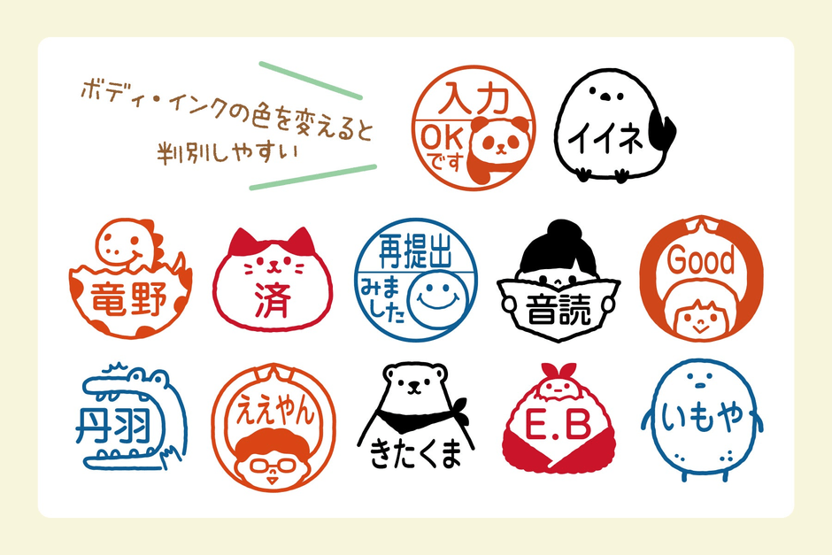 「再提出」「済」「Good」など、用途に合わせた文字を入れやすいデザインを目指しました。インクとボディカラーが選べるので、用途ごとに色分けすることができます。