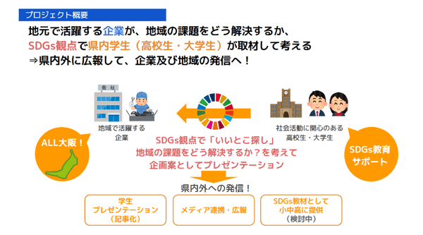 近年、企業と学校現場で「実践的にSDGsに取り組むこと」が求められているなか、SDGsに取り組みたい企業と「SDGs達成の担い手育成」教育を進める学校現場を繋ぎ、持続性のある事業構想を生み出すことと、実践的な学習の機会を作ることを目的に本プロジェクトは活動してきました。5月から始まった今年度のプロジェクトでは、近畿大学附属高等学校の高校1~3年生26名が参加し、ワークショップやカードゲーム等を通じて、SDGsや地元東大阪の社会課題について学びました。その後、8つのチームに分かれて10社以上の地元企業に取材を行い、「地域の企業の力を生かした社会課題解決企画案」を立案しました。