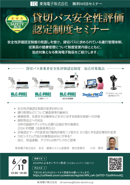 アルコール検知システム、 IT点呼システム、 運行管理システムを開発・販売する東海電子株式会社(本社:静岡県富士市 代表取締役 杉本 哲也)は、 この度、貸切バス事業者様向けに「安全性評価認定制度セミナー」を6月11日(火)に無料開催いたします。