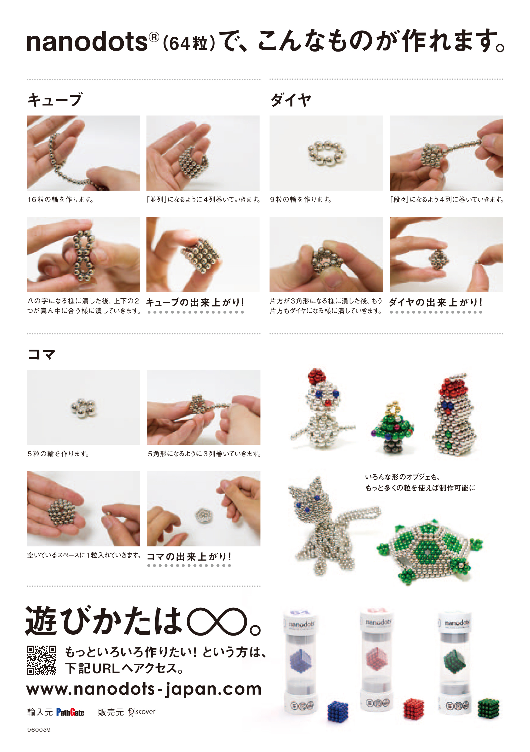 2008年末、ハンガリー人の数学者Janos Szaki氏が、“球体磁石がさまざまな形に対応できる可能性がある”ことを表現した動画をインターネット上に配信。それに触発されたカナダの製造会社 Nano Magnetics社の創業者Tim Szeto氏がSzaki氏と共同で研究し、nanodotsを開発。サイズ、強度、原料など何度も改良を重ねた完成品は2009年初頭、一部の人々にサンプルが配布され、非常に良好な反応を受けました。多くの賞を受賞し、世界でのトップセールス商品になりました。現在nanodotsは世界約30カ国で販売されており、イギリスの老舗デパート Harrodsではレゴと同等の売場を作り成功を収めています。