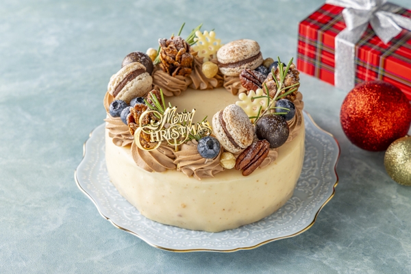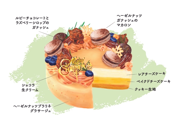 2種類のチーズケーキを重ねシックなリースに見立てた大人のためのクリスマスケーキです。下段は、発酵クリームチーズとマスカルポーネを合わせた濃厚なベイクドチーズケーキ。そして上段は、北海道産クリームチーズにグランマニエの香りを加えたなめらかなレアチーズケーキです。2種の異なる味わいと食感が織りなす深みのあるハーモニーをお楽しみいただけます。周りはヘーゼルナッツ入りのグラサージュでコーティングし、シャリシャリとしたナッツのユニークな食感をプラスしました。トップにはヘーゼルナッツのマカロンを飾り、上品なリースデザインに仕上げています。