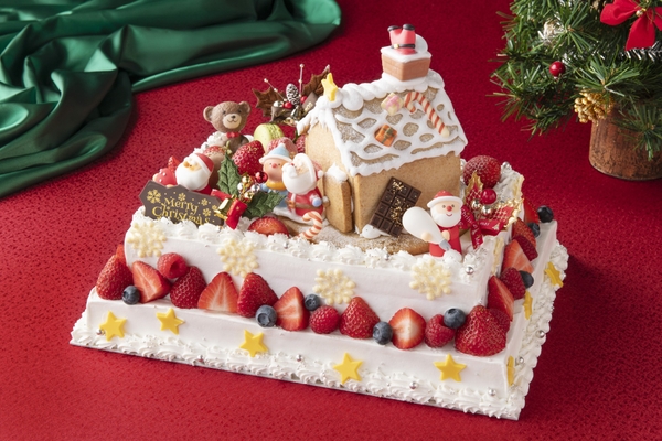 大人数でのパーティーにぴったりなケーキをご用意いたしました。ホテルメイドの生ケーキをフレッシュなまま、ご自宅やオフィスなどへデリバリーいたします(配達エリア限定)。一段目はクルミとアプリコットのブラウニー、二段目はショートケーキで、2種類の味わいを楽しめます。飾りはジンジャーブレッドハウス、マカロンなどで華やかに。それぞれ役割の異なるサンタクロースもポイントです。