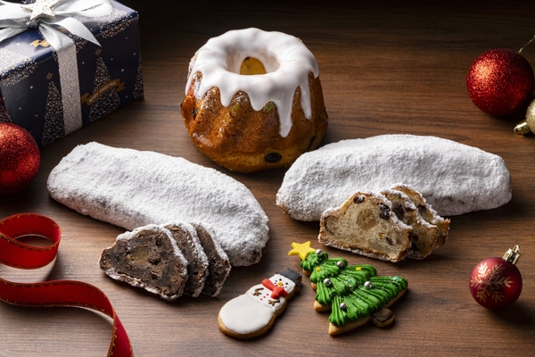 クリスマスを待ちわびるアドベントの期間に少しずつ楽しむ、ドイツの伝統菓子シュトーレン。毎年ご用意しているシュトーレンに加え、今年はチョコレートフレーバーが新登場。定番のシュトーレンは、ラム酒とブランデーに1週間じっくり漬け込んだオレンジピール、レモンピール、レーズンを混ぜ込んで焼き上げました。焼き上がり後、ドライフルーツが生地に馴染むよう2週間以上寝かせることで、しっとりとした深い味わいに。中央に入れたマジパンがアーモンドの風味と優しい甘みを添えています。チョコレートシュトーレンはココアパウダーと数種類のスパイスを生地に練り込んだ新フレーバーです。濃厚なココアのほろ苦さと、スパイスの芳醇な香りが溶け合い、洋酒の香りと相まってリッチな味わいを生み出しています。