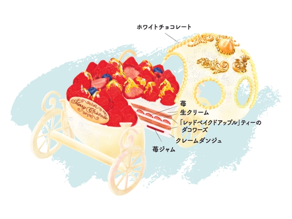 クリスマスにふさわしいキラキラと輝く馬車をイメージした、優美なシグネチャーケーキです。ホワイトチョコレートでかたどった馬車のキャリッジのような球体部分の中には、約 30 個もの苺を贅沢に使用しました。ケーキは 2 層仕立てになっており、異なる味わいが織りなすハーモニーをお楽しみいただけます。上段は、濃厚でとろけるような生クリームで苺をサンドしたリッチなショートケーキ。下段は、くちどけなめらかなクレームダンジュです。その間には、ロンネフェルト社の冬季限定「レッドベイクドアップル」ティー(ノンカフェインのハーブティー)を使用したダコワーズと苺ジャムを挟みました。焼きリンゴのような香りが、ショートケーキとクレームダンジュを絶妙につなぎます。見た目の華やかさだけでなく、細部までこだわり抜いた特別な日のためのケーキです。