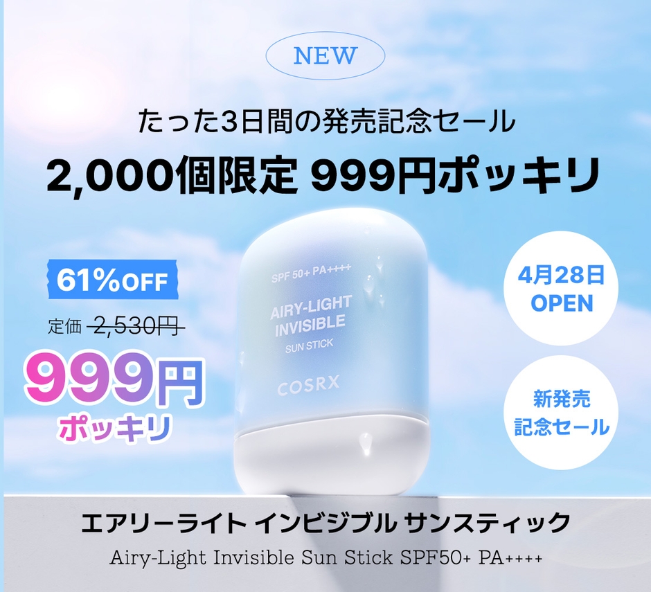世界各国に展開する韓国発のスキンケアブランド「COSRX」より、「エアリーライト インビジブルサンスティック」が2025年4月28日(月)からQoo10公式サイトにて先行販売されます。先行販売期間中の4月28日(月)〜4月30日(水)には、お得な価格でお買い求めいただけるキャンペーンも実施いたします。