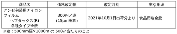 グンゼ株式会社(本社:大阪市北区、社長:佐口 敏康)は、プラスチックカンパニーが販売する包装用ナイロンフィルムについて、2021年10月1日出荷分より価格改定を実施することを決定しましたので、お知らせいたします。