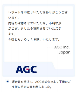 「レポートをお送りいただきありがとうございます。内容を確認させていただき、不明な点がございましたら質問させていただきます。今後ともよろしくお願いいたします。」