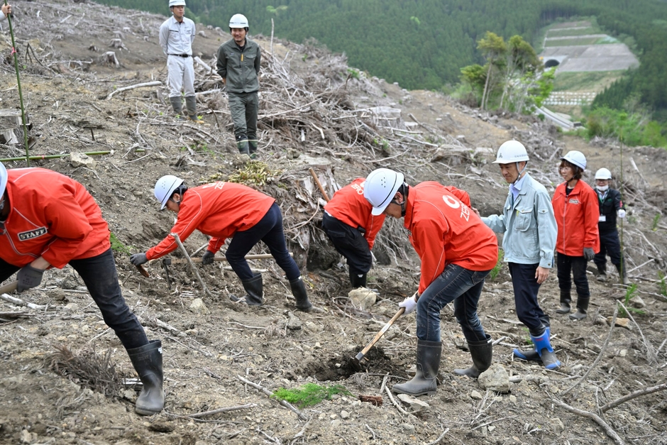 ※(上段)宮崎県での木材研修の様子、(下段)指導を受けながら実際に苗木の植林も体験、赤いユニフォームが弊社社員