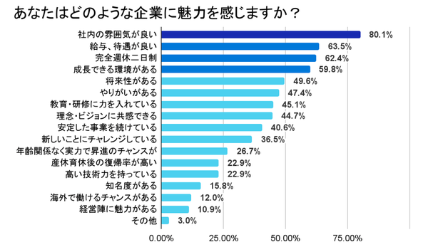 「社内の雰囲気が良い」が最多の80.1%、「給与、待遇が良い」が63.5%、次いで「完全週休二日制」が62.4%でした。社内の雰囲気に加えて、制度などの働き方に魅力を感じている学生が多いことが推測できます。