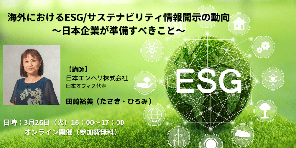 BCPと危機管理の専門メディア「リスク対策.com」(新建新聞社)は3月26日(火曜日)、「海外におけるESG/サステナビリティ情報開示の動向」をテーマにした勉強会を開催します。講師は、海外におけるESGの動向や法規則に詳しい日本エンヘサ株式会社日本オフィス代表の田崎裕美氏です。