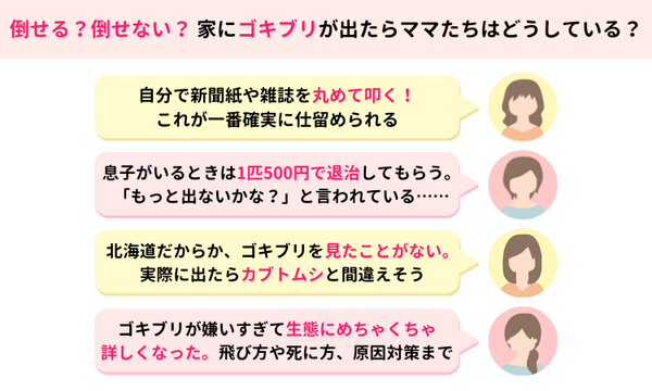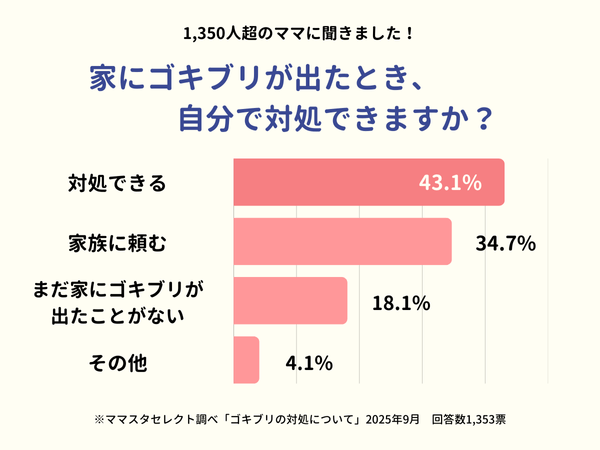 アンケートの選択肢は「対処できる」「家族に頼む」「まだ家にゴキブリが出たことがない」「その他」の4択。フリー回答からは、ママたちの本音と家庭ごとのユニークな戦い方が見えてきました。
