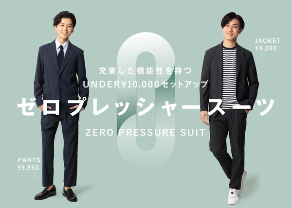 『ゼロプレッシャースーツ』は、税込10,000円を下回る価格で購入できる“大人の2着目スーツ”として企画したセットアップスーツです。このスーツは、手ごろな価格とスポーツ素材を使用した高い機能性に加えて、ビジネスからカジュアルまで様々なスタイルとの相性の良さなどが反響を呼んでおり、7月にECサイトで先行発売して以来、計画を上回る売れ行きとなっています。現在ではサイズによって完売も出ている他、店で着心地を体感したいという声も多くいただいていることから、当初の予定を早めて店舗販売を開始することとしました。