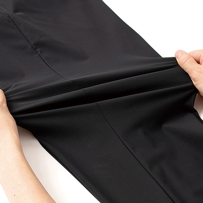 このスーツは、水着などのスポーツウェアにも使用される機能性ファブリックを採用しています。生地は旭化成株式会社のストレッチ繊維「ROICA®(ロイカ)」を使用したニット生地で、縦・横の両方向への高い伸縮性が特徴。一般的なスーツと比べて縦・横ともに6倍(当社比)のストレッチ性を誇るなど、抜群の動作性を体感できます。また、着用時の圧迫感(着圧)が極めて少ない他、裏地・芯地・肩パッドなどの付属を可能な限り省くことで、これまでにない“解放的”な着用感を実現しています。このようなストレスフリーな着心地に加えて、生地は伸縮後の回復性に優れており、シワになりにくいのも特徴です。また、撥水性があり雨や汚れに強く、自宅の洗濯機で丸洗いも可能でいつでも清潔に着用できます。